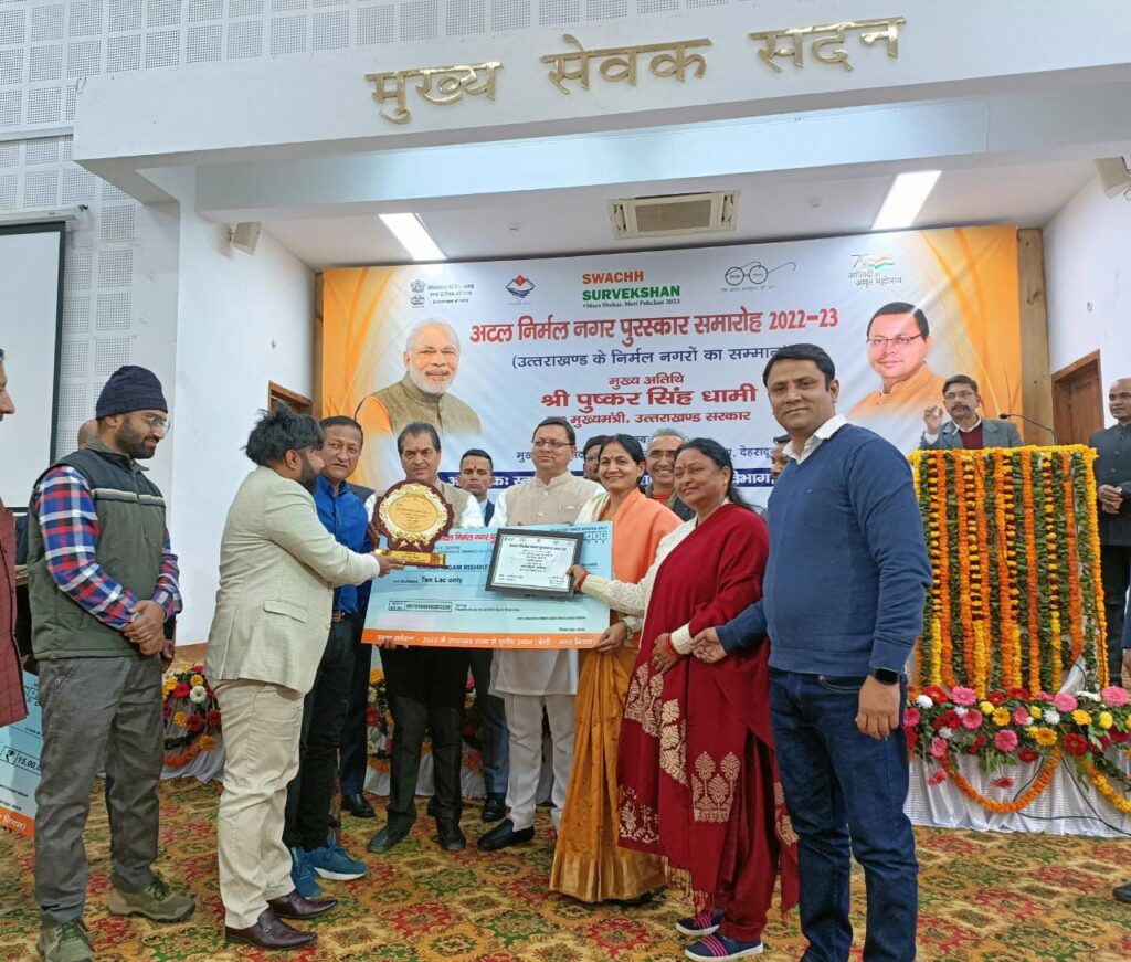 सोमवार को अटल निर्मल पुरूस्कार में प्रदेश के तमाम नगर निकायों सहित देश के गंगा टाऊन में तीसरा स्थान हासिल करने पर उत्तराखंड के मुख्यमंत्री ने ऋषिकेश महापौर को सम्मानित किया। मुख्यमंत्री का आभार जताते हुए महापौर ने बताया कि सीमित संसाधनों के बीच अटल निर्मल पुरुस्कार के लिए ऋषिकेश नगर निगम का चयनित होना एक बड़ी उपलब्धि है।इसका श्रेय उन्होंने निगम के स्वच्छता प्रहरियों के अथक प्रयासों के साथ शहर की प्रबुद्ध जनता एवं समाजसेवी संस्थाओं को देते हुए कहा कि जन सहयोग की वजह से ही नगर निगम को यह प्रतिष्ठित सम्मान हासिल हुआ है। इस सफलता का श्रेय उन्होंने निगम की पूरी टीम और यहां के जागरूक नागरिकों को दिया है। उन्होंने बताया कि घर-घर कूड़ा उठाने की योजना हो या फिर सार्वजनिक स्थलों पर कूड़ा ना फेंकने का कार्य, सभी दृष्टिकोण से निगम सफल रहा है। ठोस अपशिष्ट प्रबंधन को लेकर बेहतर कार्य किए गए हैं। जैविक और अजैविक कचरे को पृथक कर कंपोस्ट बनाने के कार्य में काफी सुधार आया है।