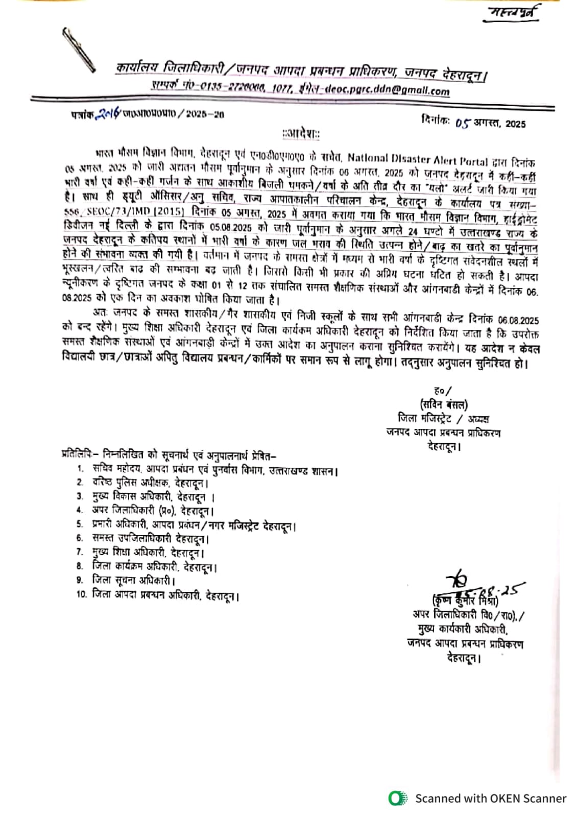 भारी बारिश के कारण कई क्षेत्रों में बाढ़ जैसे हालात पैदा हो सकते हैं यही कारण है की जिलाधिकारी देहरादून कार्यालय से यह आदेश देर रात्रि करीब 12 बजे जारी किया गया है।
